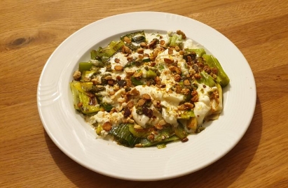 Ajouter les tronçons de poireaux par-dessus, des morceaux de burrata, du pesto, des zestes de citron, des noisettes concassées, quelques feuilles de basilic, une pincée de fleur de sel et de piment d’Espelette.
