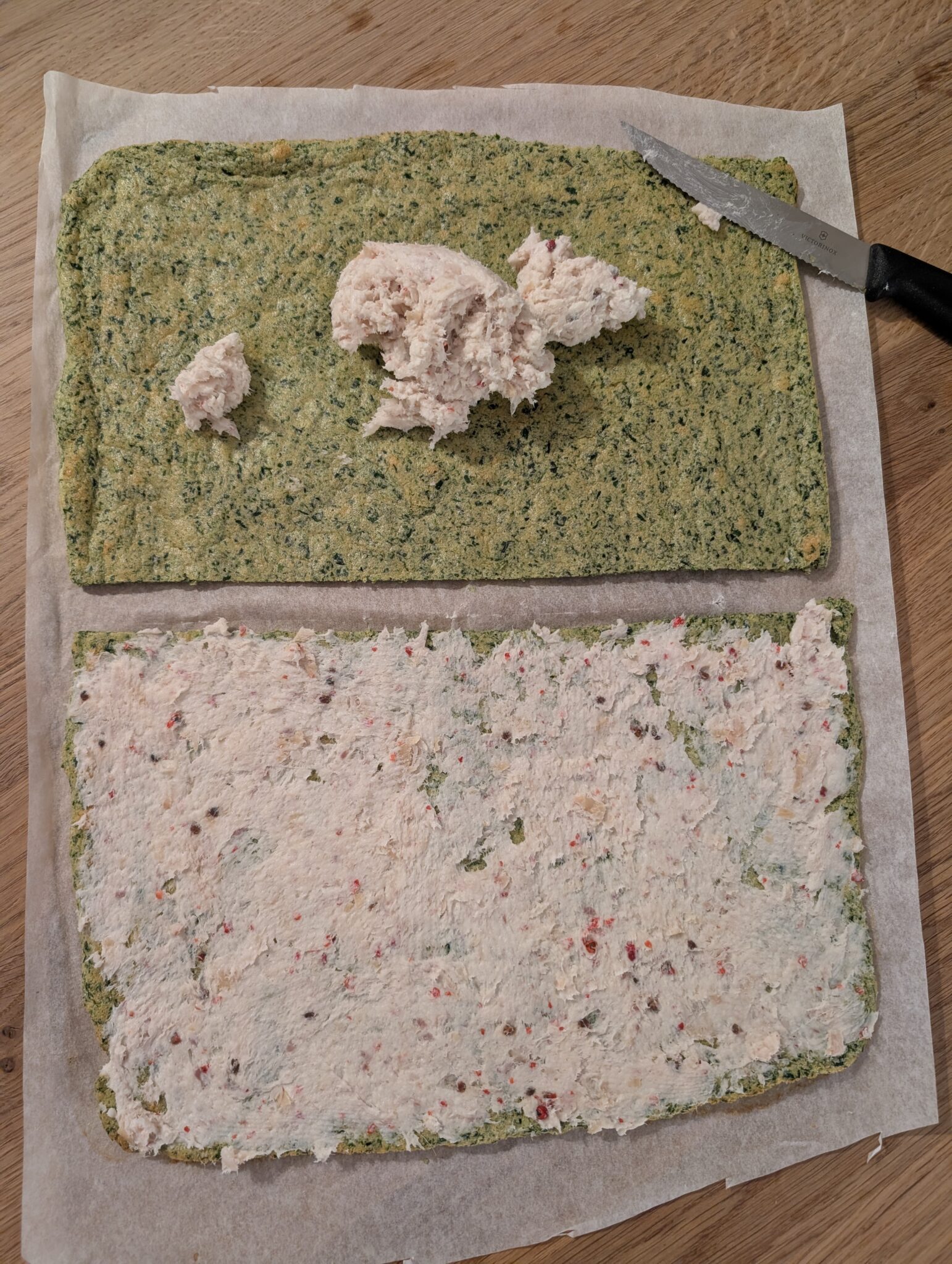 Dans un bol, coupez la truite en petits morceaux. Ajoutez le fromage frais et le poivre rose concassé. Mélangez à la fourchette jusqu’à obtention d’une texture lisse et tartinable. Étalez cette préparation sur les deux moitiés de pâte.